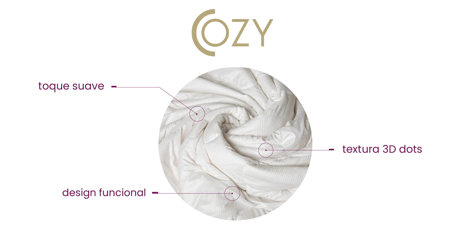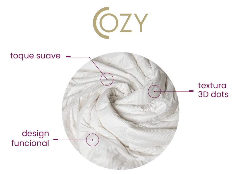 Com um design sofisticado e inovador, o Cozy™ possui a exclusiva textura 3D Dots™, que oferece um toque macio e uma sensação delicada ao contato com a pele. Além disso, seu enchimento com Long Fiber IWS™ distribui o calor de forma equilibrada, garantindo um conforto incomparável sem o volume de cobertores tradicionais.