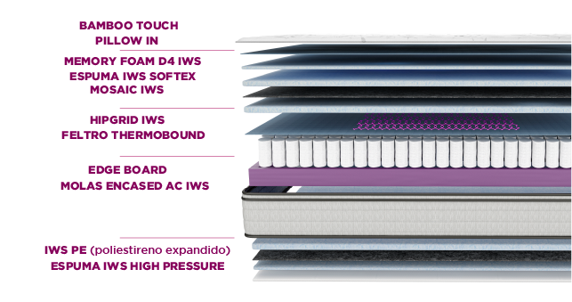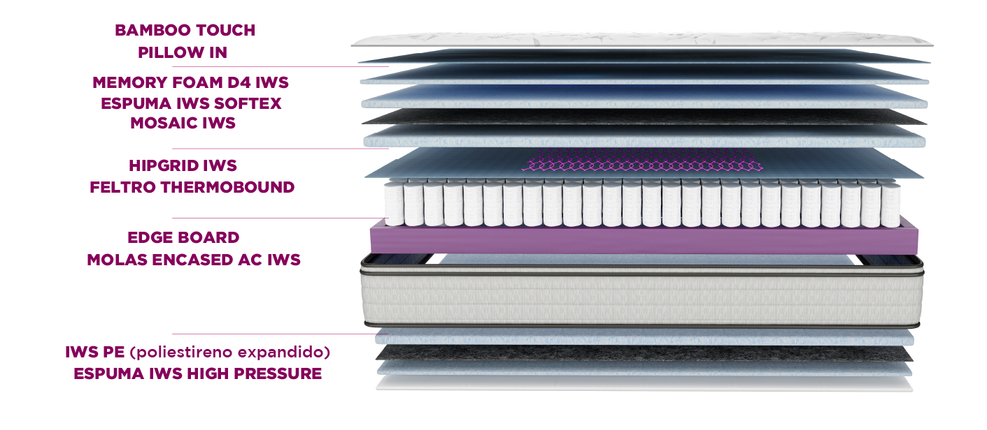 A tecnologia IWS Mosaic® cria um mosaico composto de pequenas partículas de espumas premium IWS. Estas espumas, juntamente com sua forma construtiva, proporcionam alta resistência, suporte e respirabilidade, além de ajudar no molejo e evitar efeito onda no colchão.