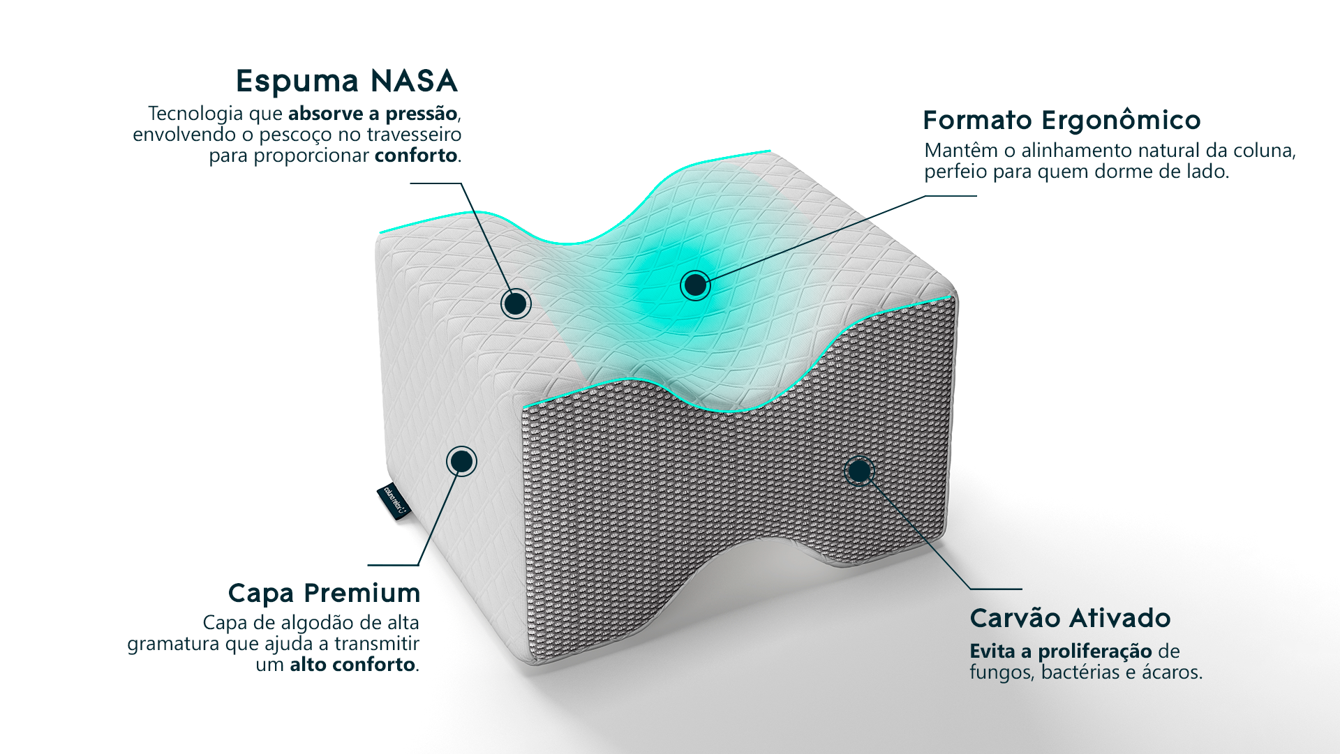 Seu formato ergonômico permite que sua cabeça fique centralizada e segura durante o sono, reduzindo a pressão através do seu alinhamento na curvatura cervical. Ele é perfeito para quem dorme de lado, de bruços ou de costas, com espaço adequado aos ombros reduzindo a rigidez ao acordar.