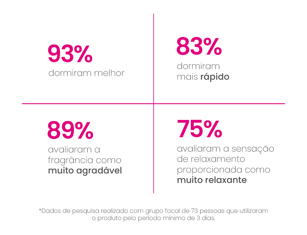 Fragrância composta por óleos essenciais 100% naturais, cujas propriedades terapêuticas favorecem um sono sereno e revitalizante.