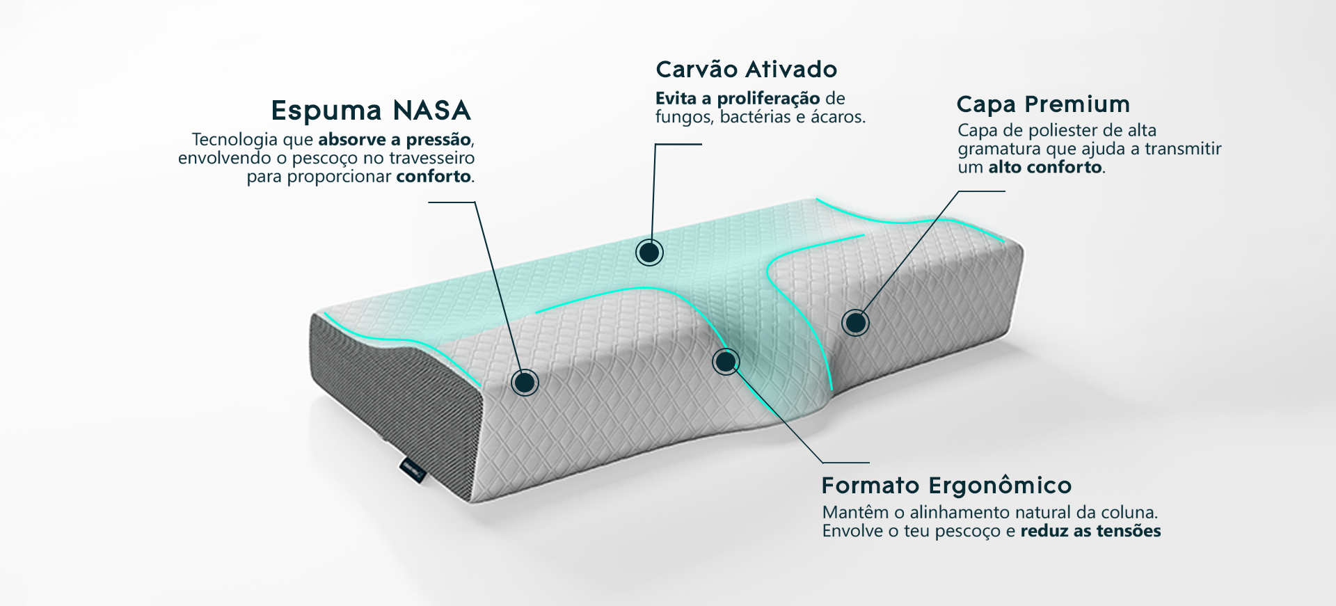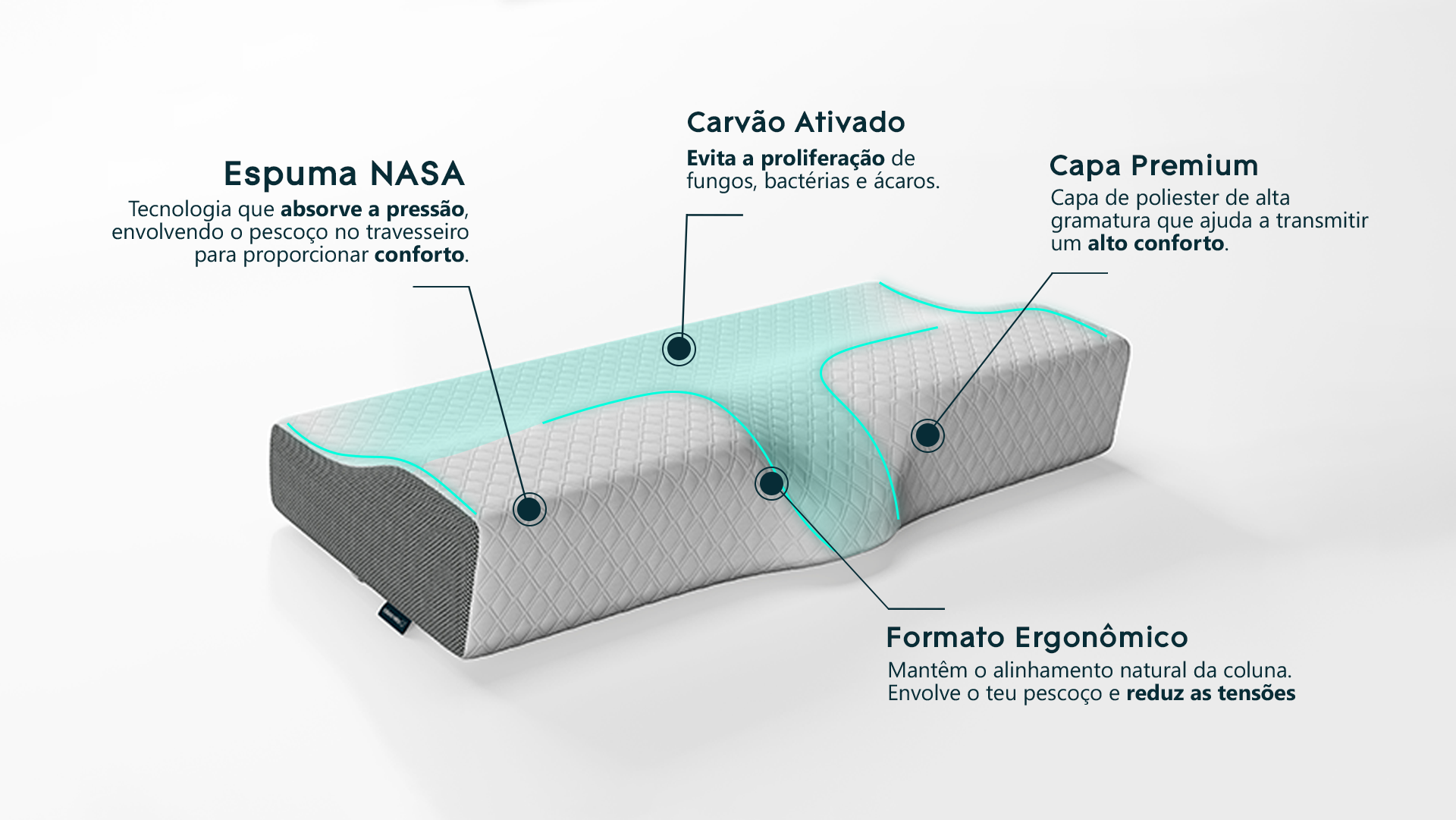 O travesseiro recomendado pelos especialistas. Ergonômico, com carvão ativado, alinha a coluna e alivia dores em pescoço, ombros e costas enquanto você dorme.