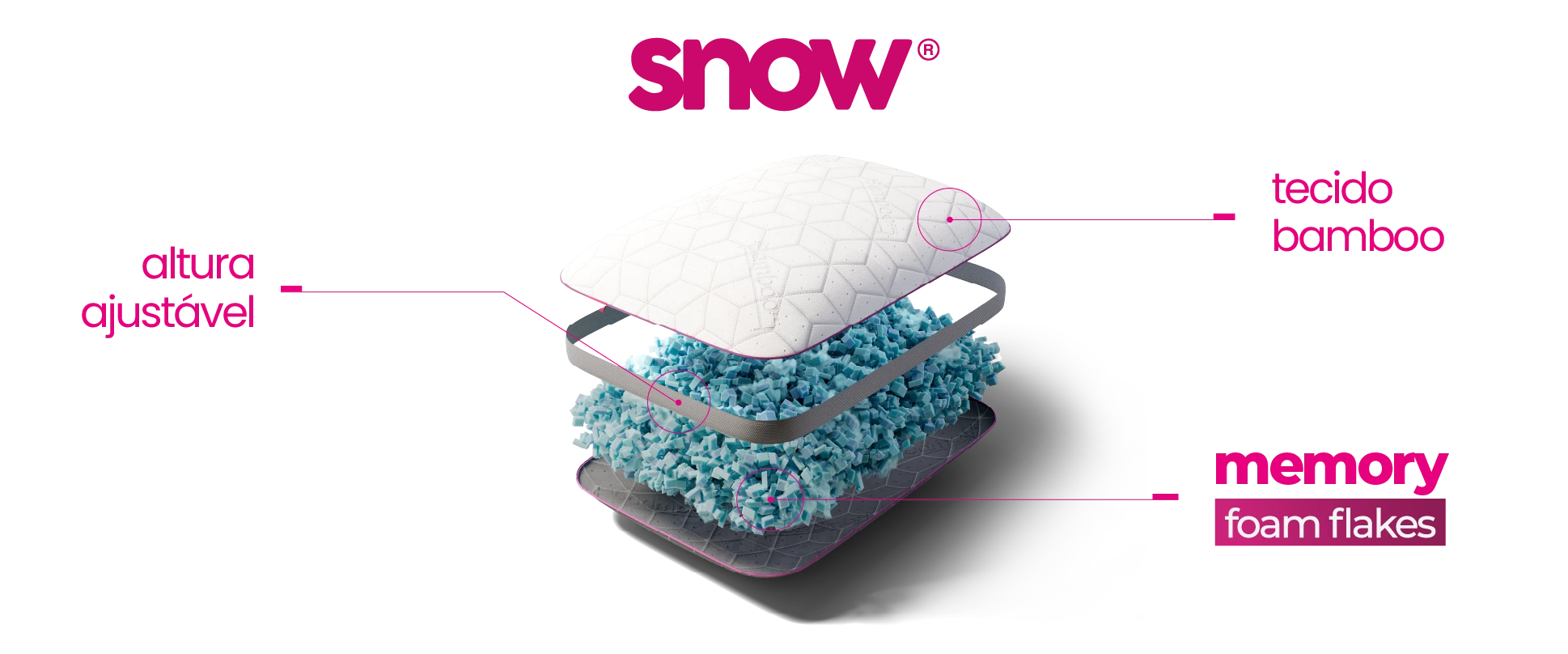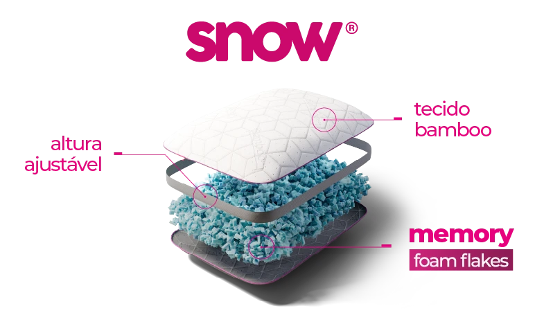 fabricado com espumas de memory foam flakes e partículas de gel, o snow® garante uma distribuição uniforme da pressão da cabeça e pescoço, ajudando a aliviar e prevenir dores causadas por pontos de tensão.